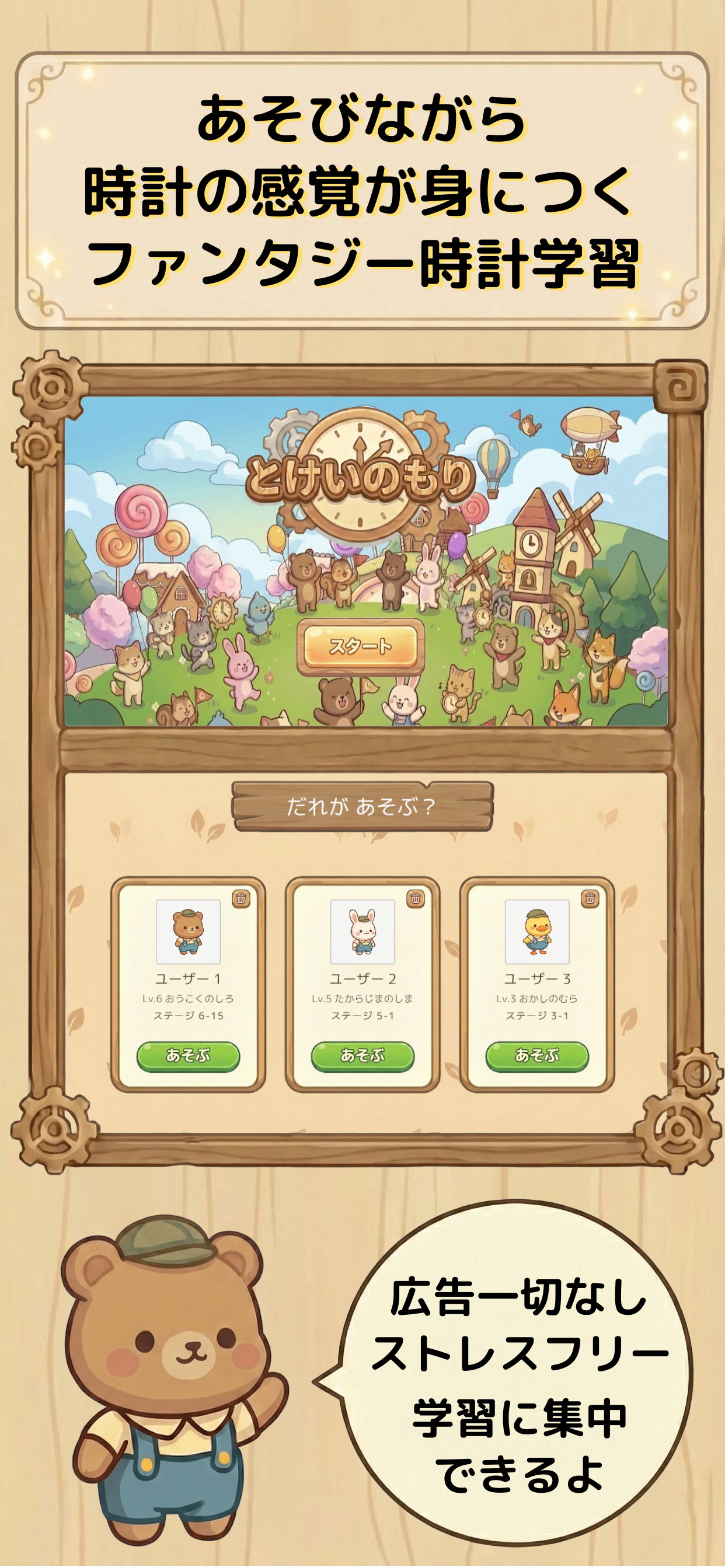 「○時ちょうど」から「1分刻み」まで、段階的に無理なく学べます