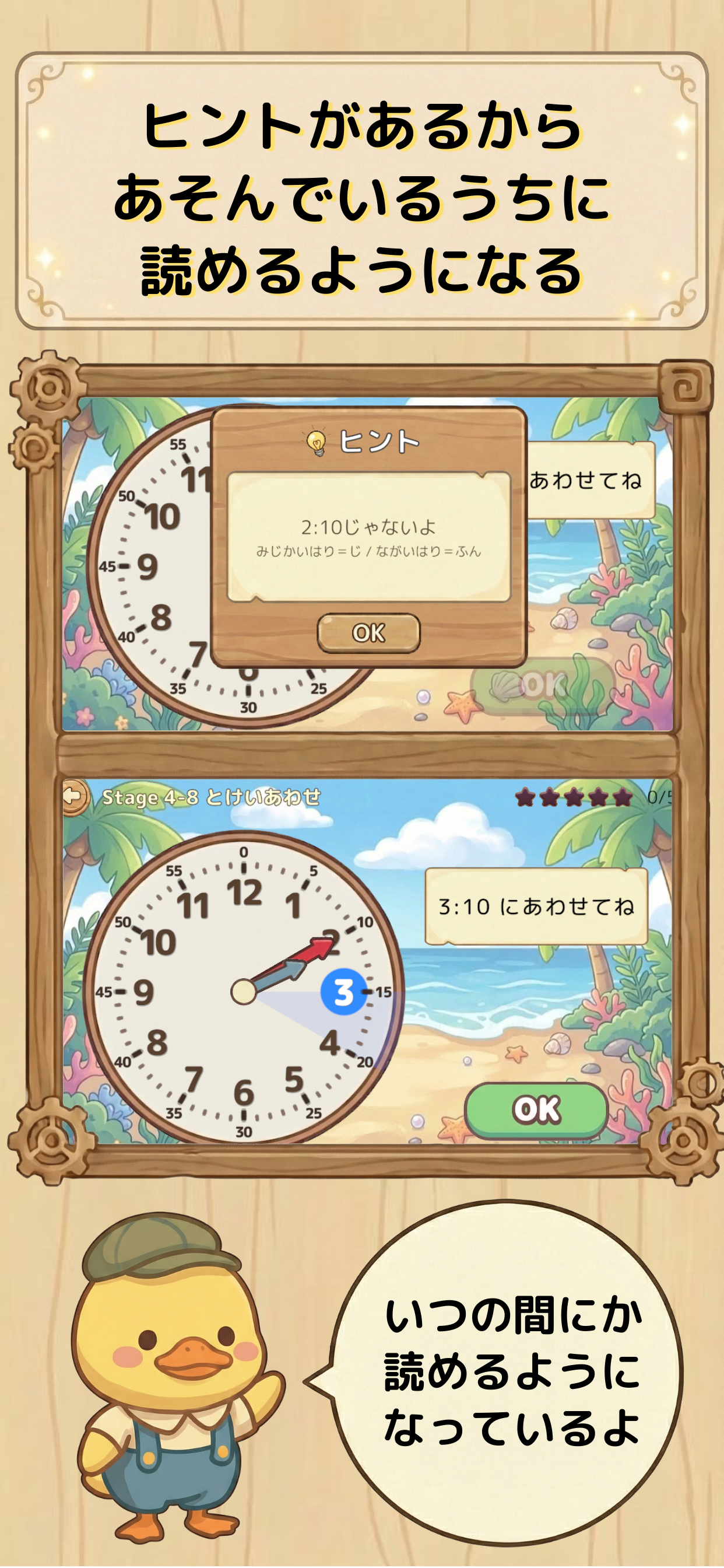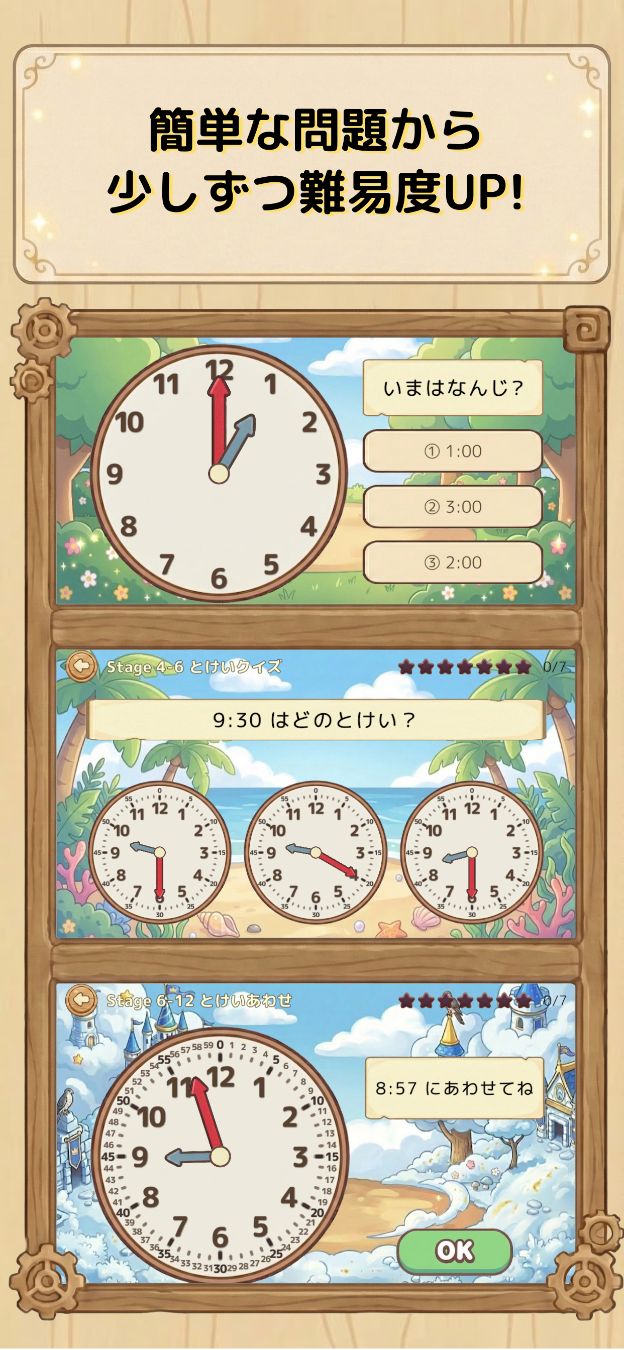 「○時ちょうど」から「1分刻み」まで、段階的に無理なく学べます